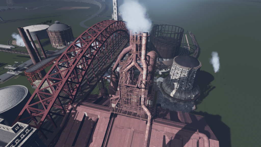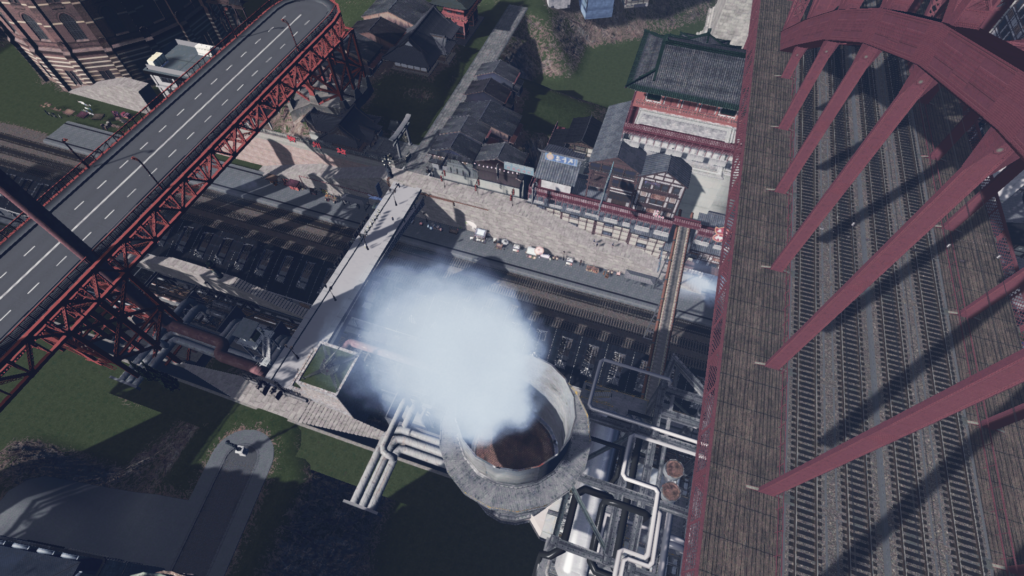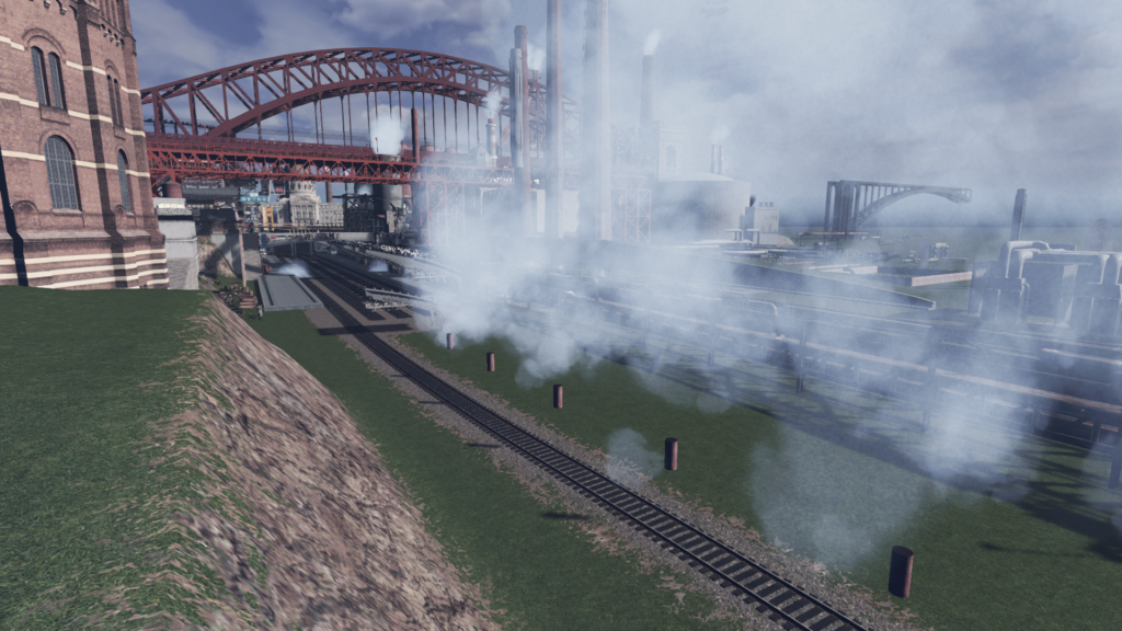 当初想定していた構図でスクショを撮って確認したところ、工場の煙突が丁度機関車の煙突と重なってエモかったため、構図を少しだけ変更してみました。