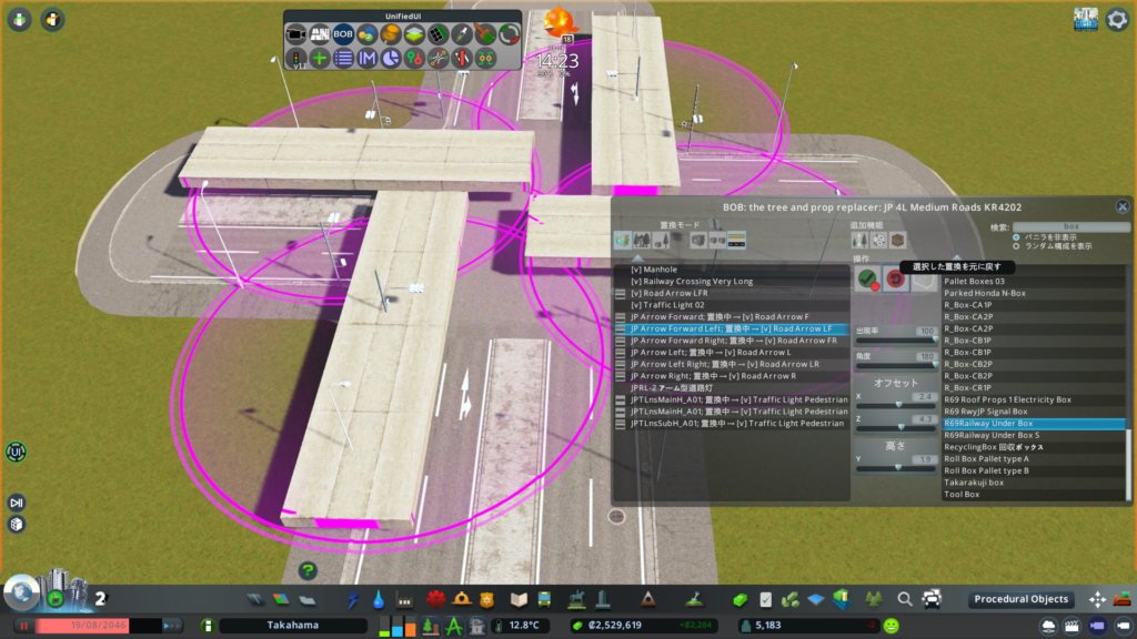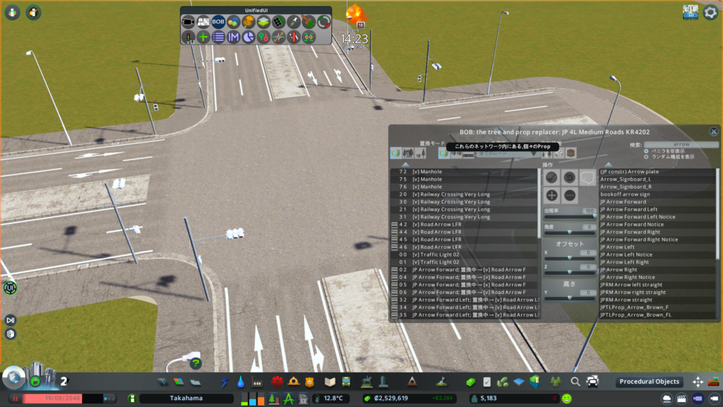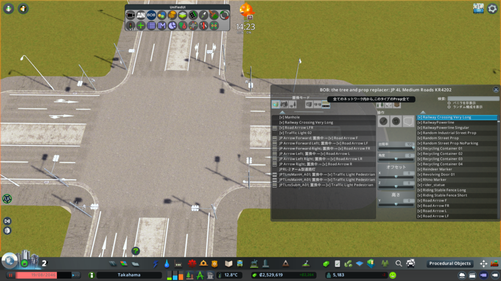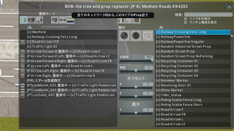 パネル左上の「置換モード」の一番右にある「全てのネットワーク内から、このタイプのProp全て」を予め選択しておきます。これにより、バニラの路面標示を一括で切り替えることができます。