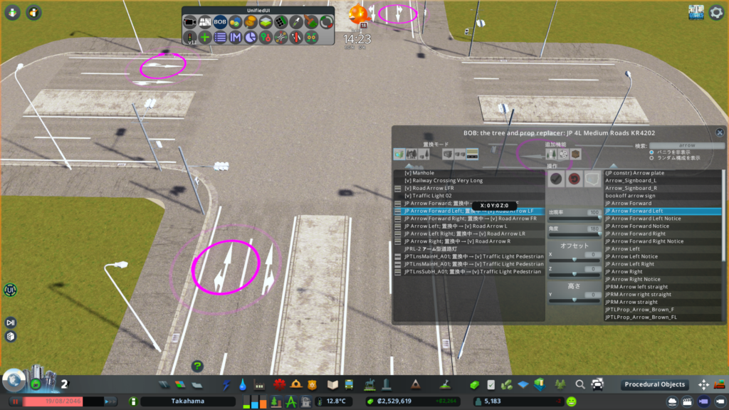 画像は既に切替済みですが、左側のリストから「[v]Road Arrow LF」を、右側のリストから「JP Arrow Forward Left」を選択すると、下の画像のように、マップ上でプレビューされます。おそらく向きが逆かと思いますので、中央のパロメーターから角度を180度に設定し、緑に点いたチェックのボタンをクリックすると、これに置き換えることができます。