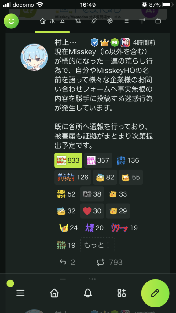 私がXでフォローしている人の内今でもアクティブなのは、場所の報告をしてくれるたまきさんbotと、えちいリノートを沢山くれるLinoさんしかいねぇのだ。あとコミュニティづくりにも失敗し、眺めているのは村上さんぐらいしかいねぇのだ。悲しいのだ……。