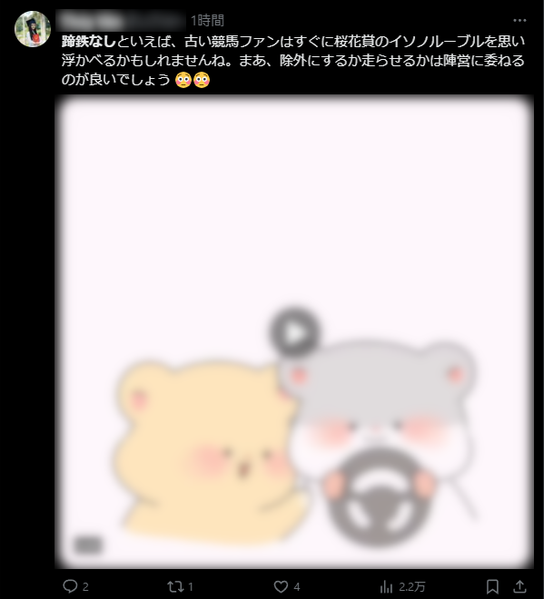 中央競馬関連で「蹄鉄なし」、地震関連で「緊急地震速報」がトレンド入りした2024年2月11日夕方頃の「話題を検索」から「話題のツイート(原文ママ)」の欄です。余談ですが何故か『ポスト』ではなく『ツイート』のままなんですよ(笑)