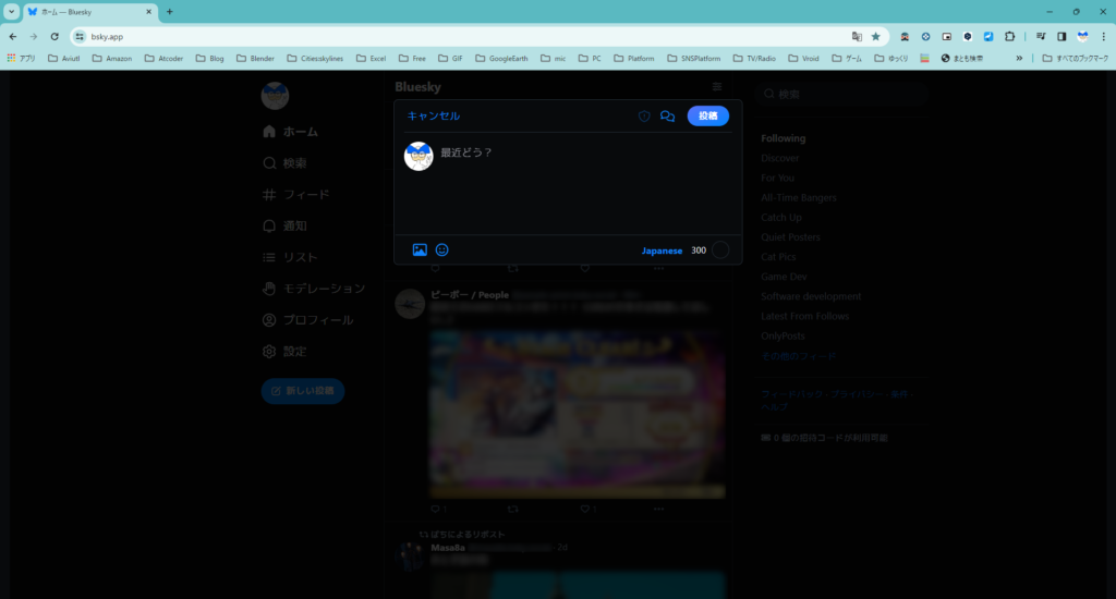 misskey同様の分散型サーバーで、争いの火種であるハッシュタグやトレンドの類もなく、実に静かなタイムラインが広がっています。なので、まず参加者全員のチャットが滝のように流れて、これをフィルターで掬うmisskeyとは大きく違うポイントかと思います。で初見blueskyにまず思ったのは……。