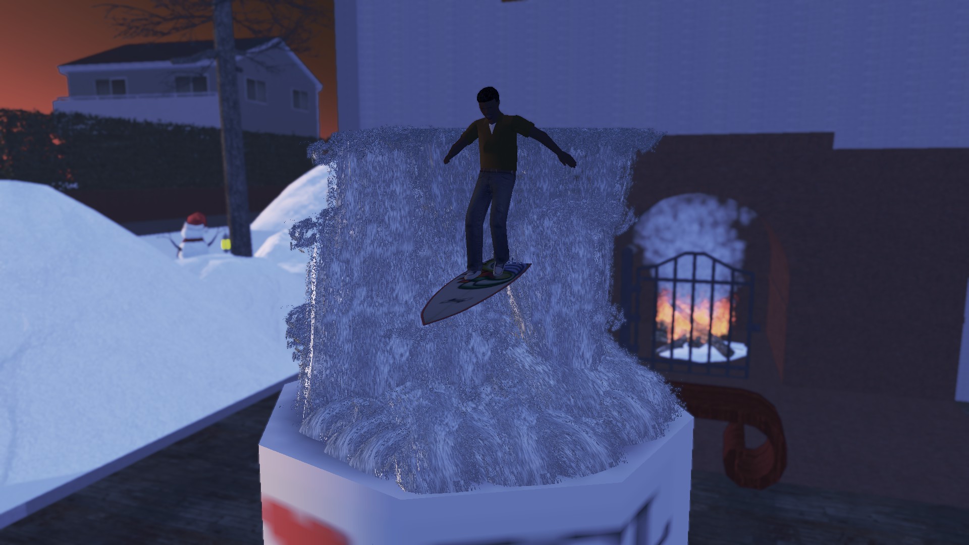 男の人、サーフボード、波、マグカップと、既存のアセットを組み合わせ、これを表現しました。